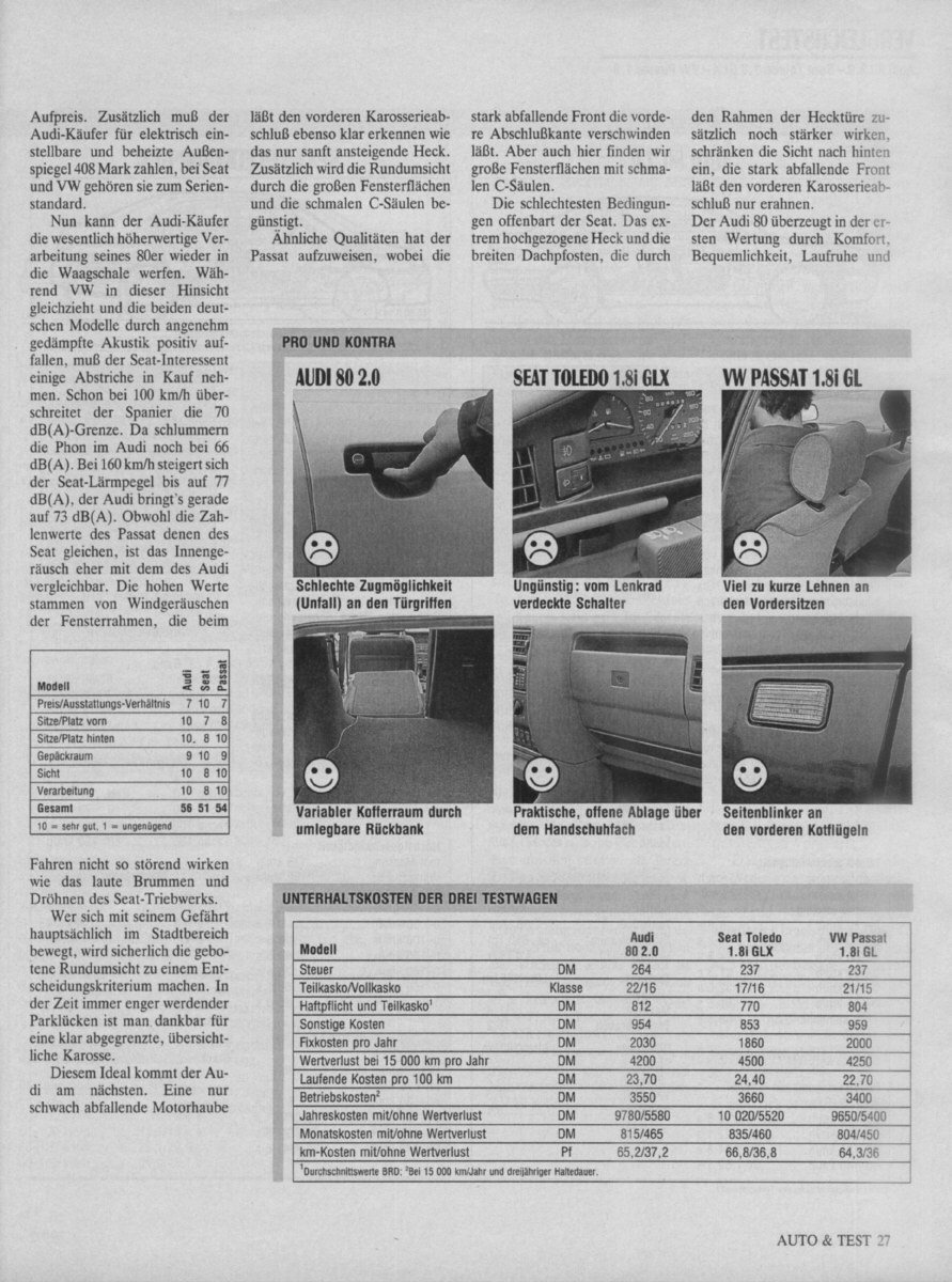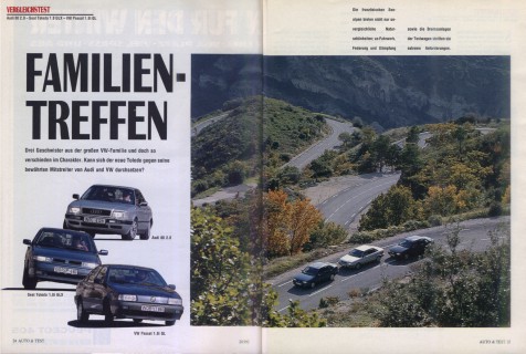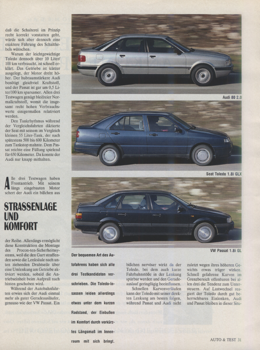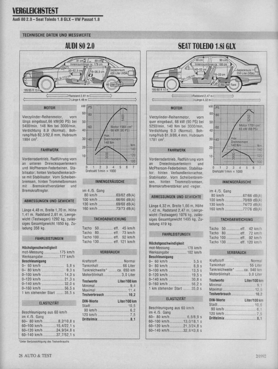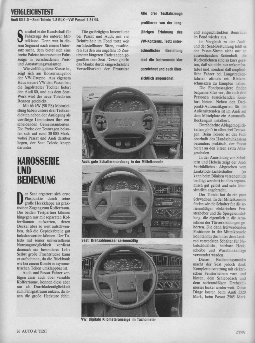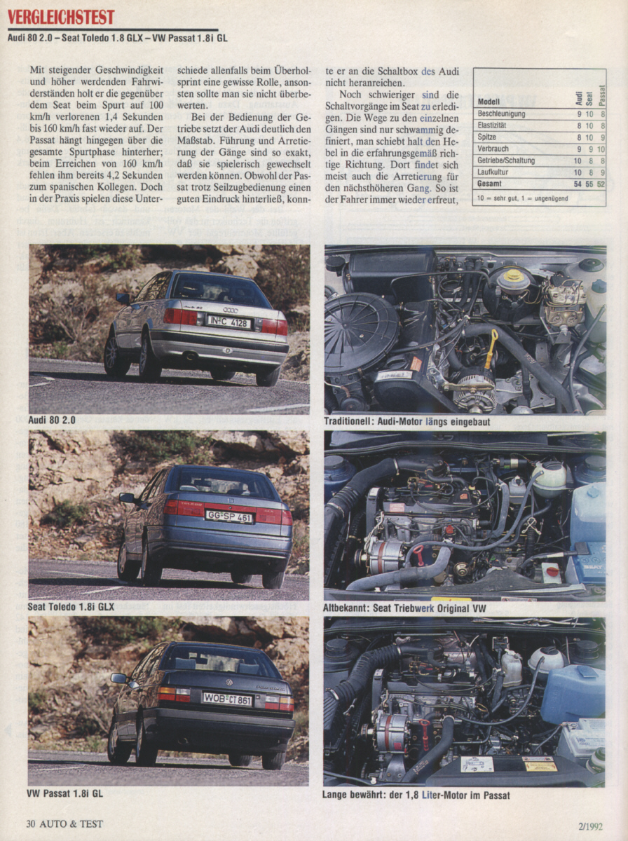 Großer mot-Vergleichstest Ausgabe 02/1992 Audi 80 2.0 - VW Passat 1.8i - Seat Toledo 1.8i